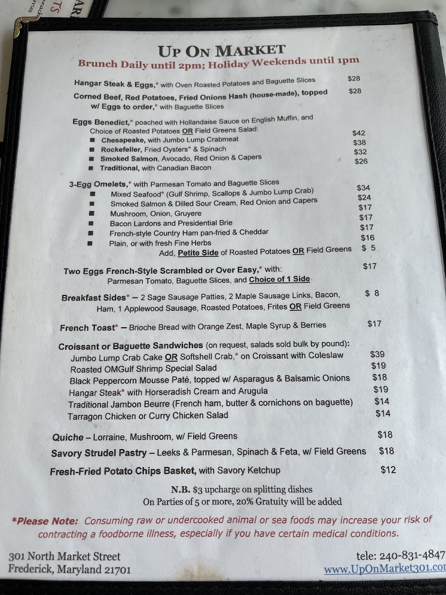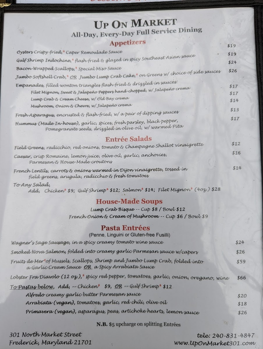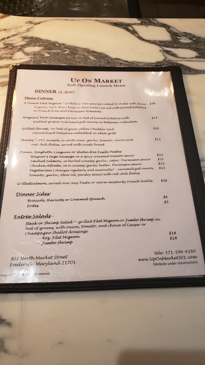 Welcome to Up on Market Bistro & Inn, a hidden gem nestled in Frederick, MD. This charming eatery and inn invites guests to indulge in a menu brimming with thoughtfully crafted dishes. Start your meal with enticing Entree Salads like the refreshing Field Green Salad or the classic Caesar Salad, each harmonizing flavors with fresh ingredients.